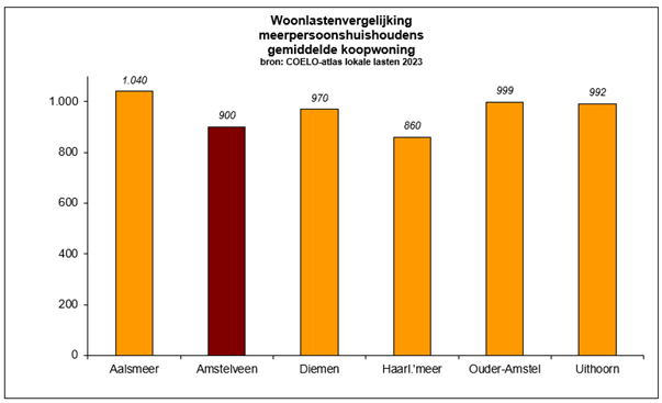 Voor 2023 bedragen de Amstelveense woonlasten voor een gemiddelde koopwoning (meerpersoonshuishoudens) € 900. De gemiddelde woonlasten voor eigenaar-bewoners liggen op € 944. Ten opzichte van 2022 betekent dit een gemiddelde stijging van 4,8%.